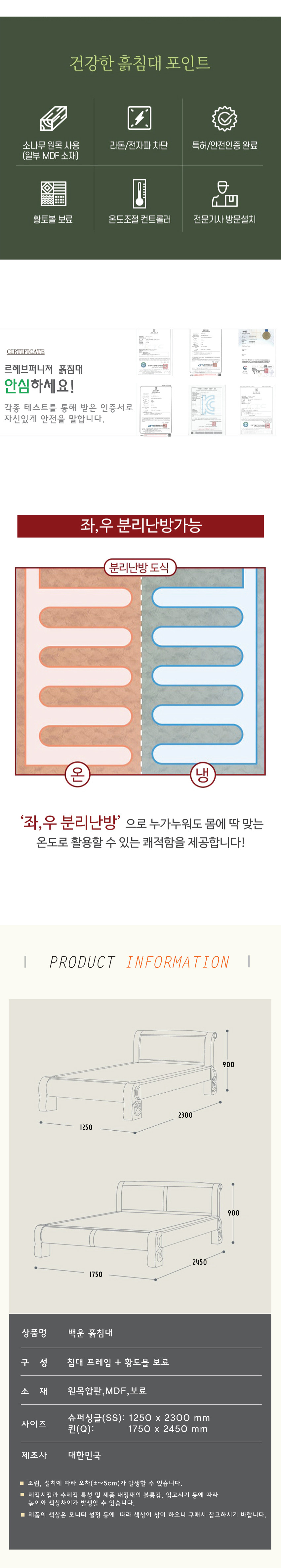 백운 흙침대(SS)/ 황토흙침대 1인용(보료포함)